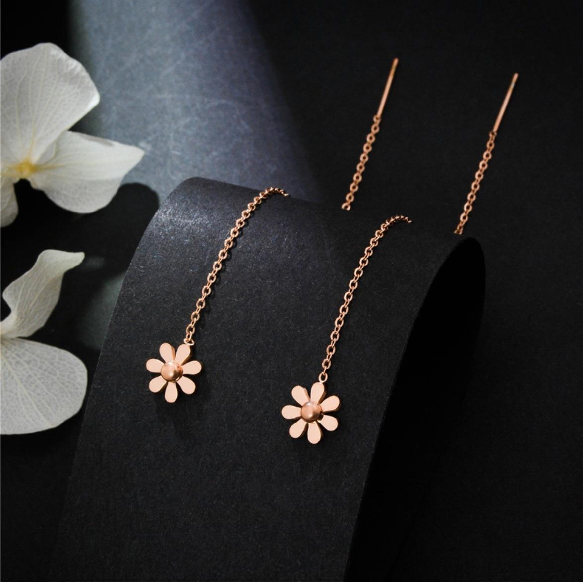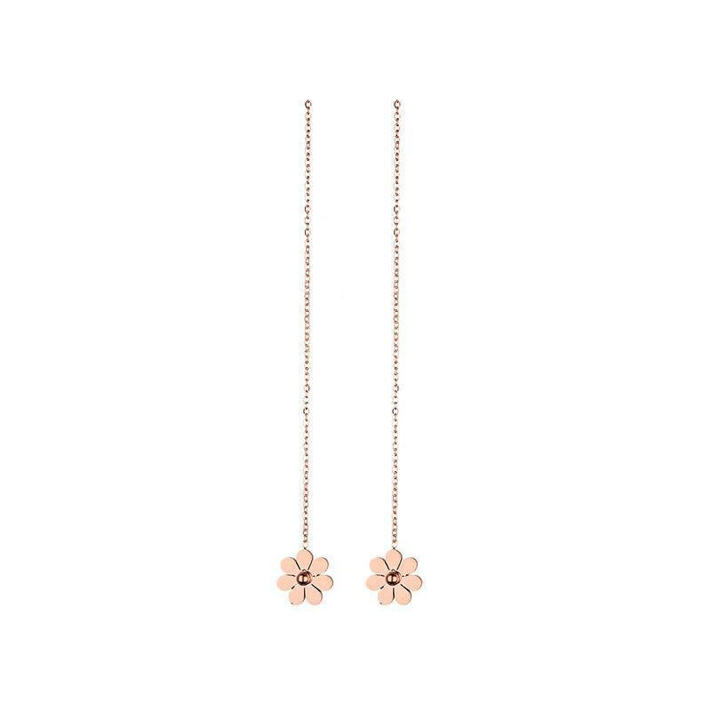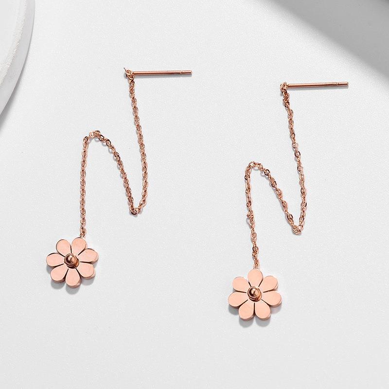Steel Little Daisy Flower Tassel Hanging Rose Gold Earrings