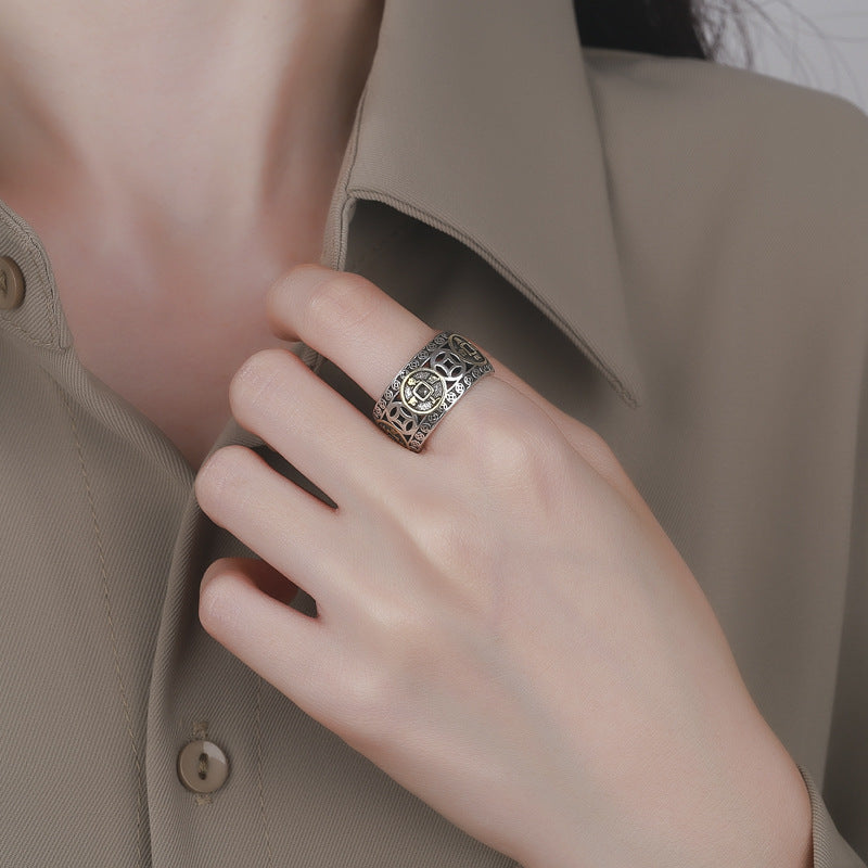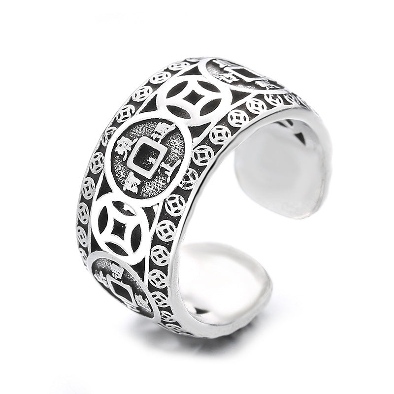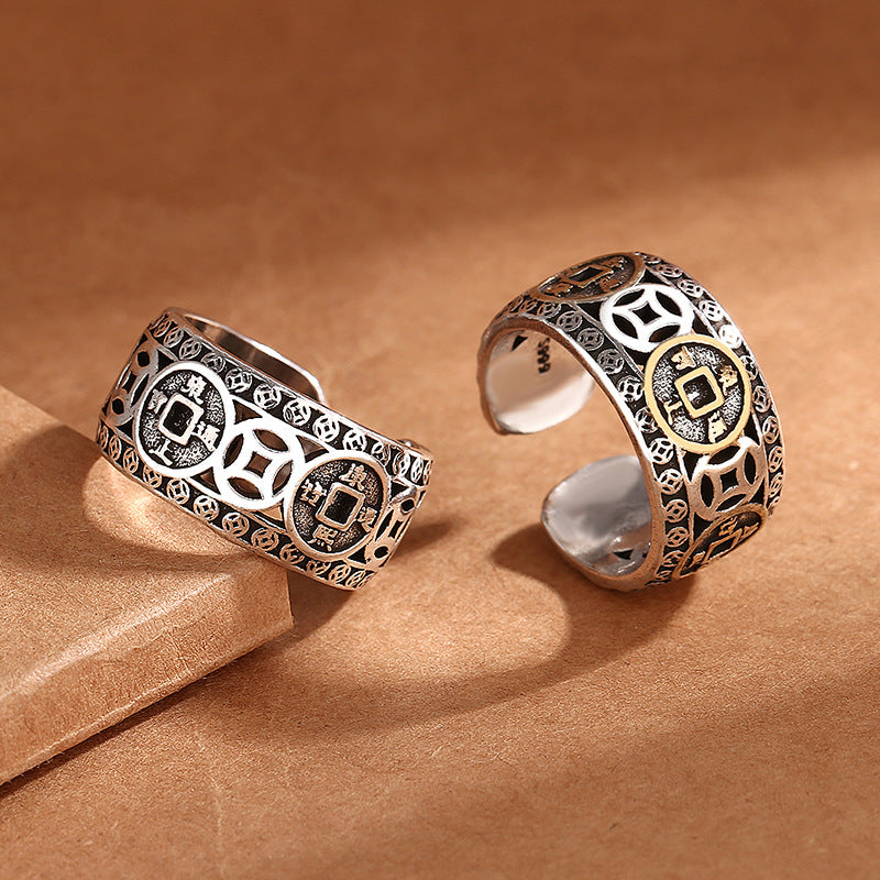Women's & Men's Sier Vintage Thai Five Emperors Coin Money Drawing Luck Rings