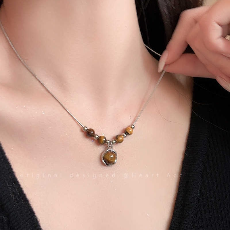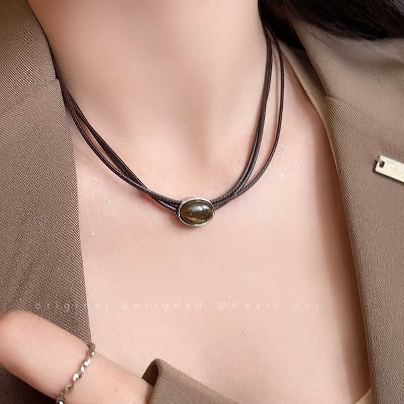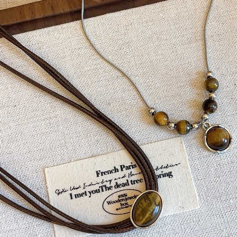 Women's Retro Leather Tiger Eye Chinese Style Twin Niche Necklaces